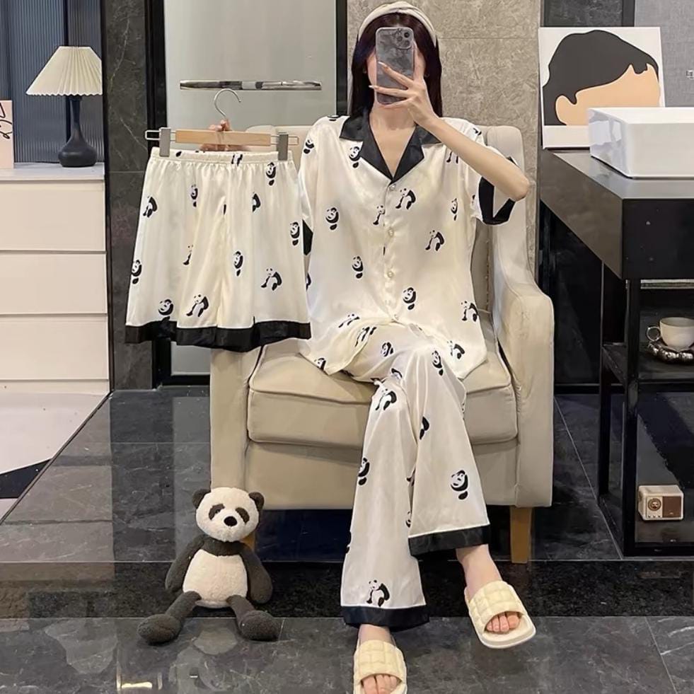 طقم بيجامة صيفي فاخر، يجمع بين الأناقة والراحة بتصميم كلاسيكي عصري. يتكون الطقم من قميص بأزرار كاملة وبنطال طويل. يتميز بلونه الأبيض الأنيق الذي يمنحه مظهراً راقياً، مع نقوش لطيفة لحيوانات الباندا الصغيرة باللونين الأبيض والأسود. وتبرز الحواف باللون الأسود التي تحدد ياقة القميص، جيب الصدر، وأطراف الأكمام والبنطال، مما يضيف لمسة من الجاذبية والأنوثة.