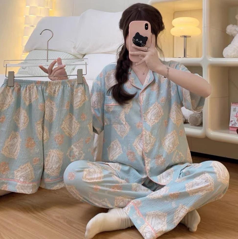 اكتشفي قمة الراحة والأناقة مع طقم البيجامة النسائي الصيفي هذا، المصمم خصيصًا ليمنحك شعورًا بالانتعاش والاسترخاء. يتكون الطقم من ثلاث قطع: قميص بأكمام قصيرة، وشورت خفيف، وبنطال طويل، مما يتيح لكِ الاختيار المثالي لكل الأجواء.