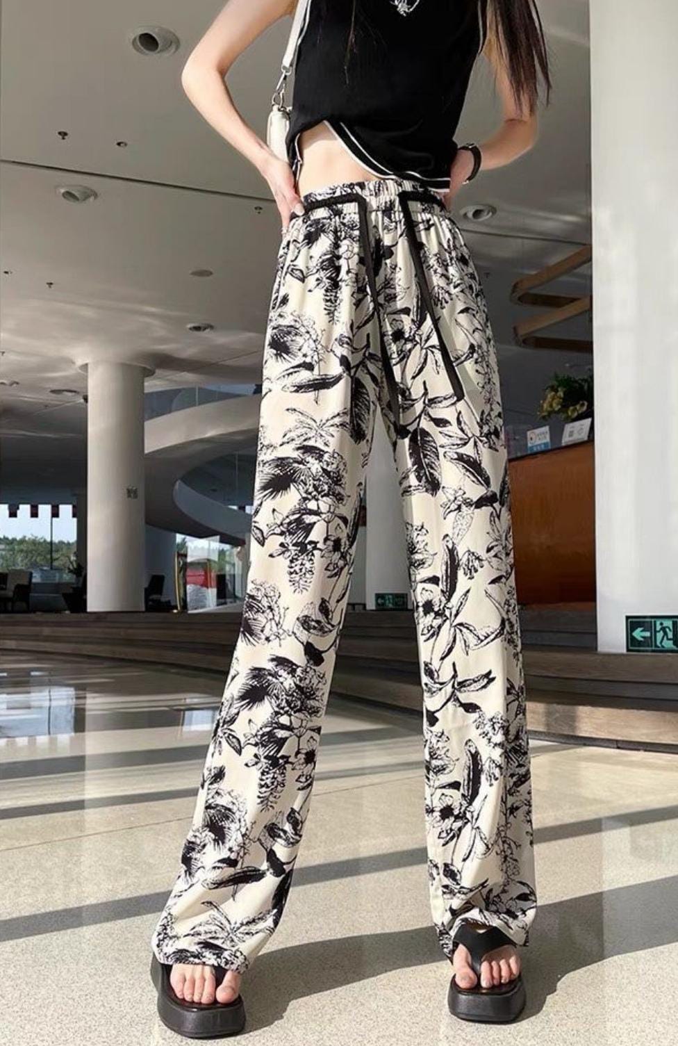 بنطلون واسع ومريح بقصة وايد ليج، بطبعة نباتية باللونين الأبيض والأسود.