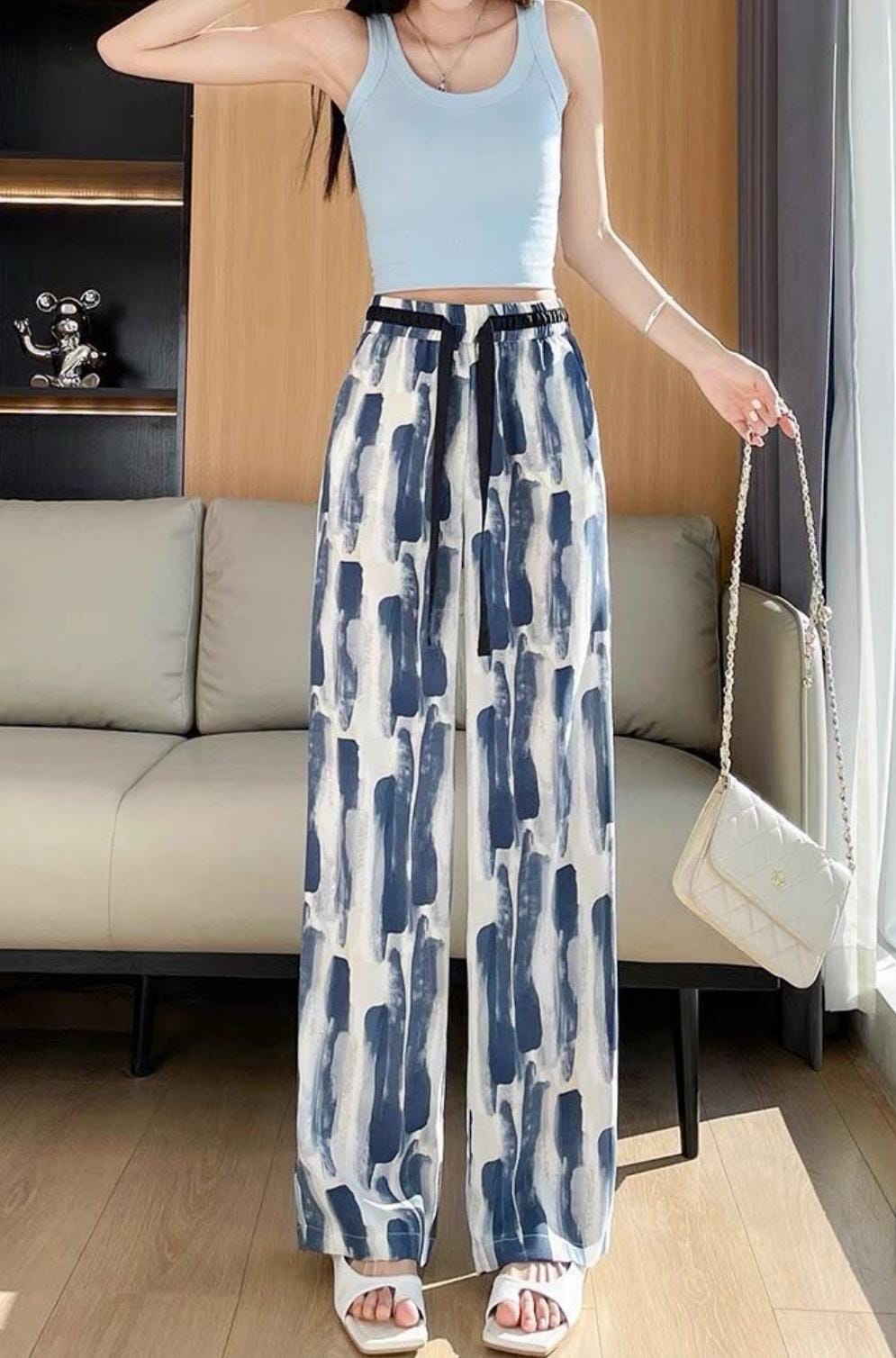 بنطلون واسع ومريح بقصة وايد ليج، بطبعة Brushstrokes باللونين الأزرق والأبيض.